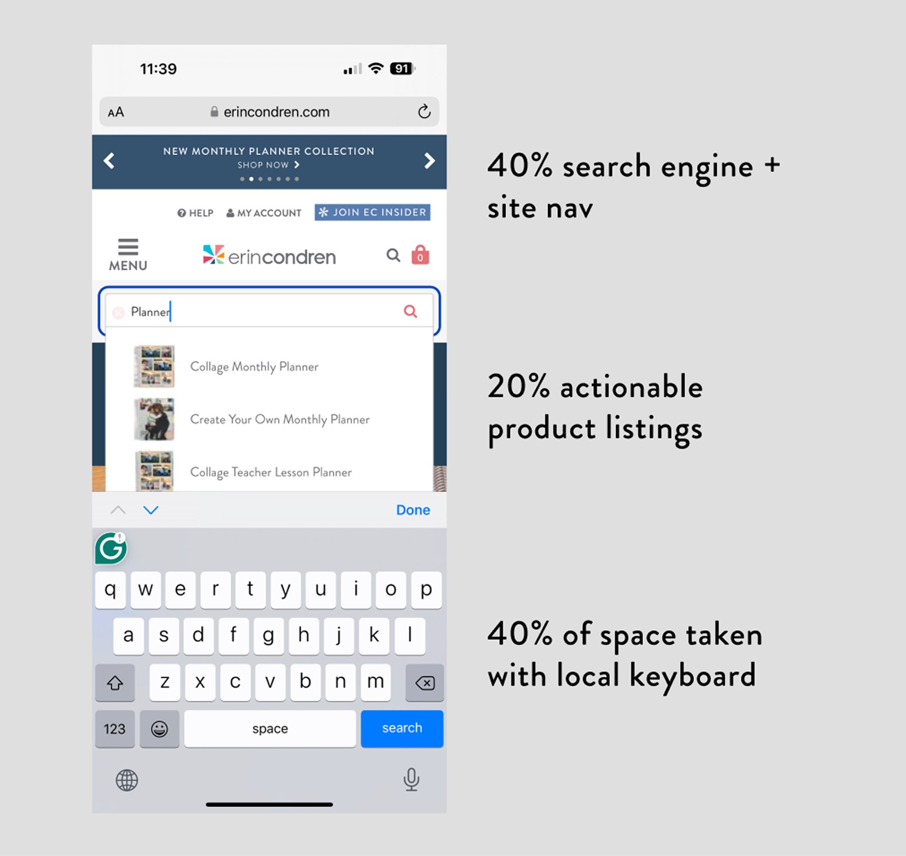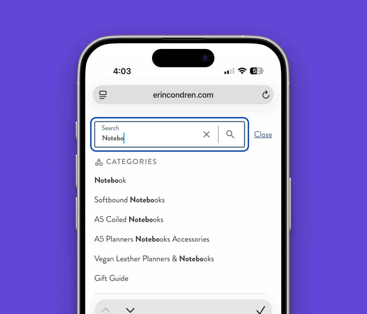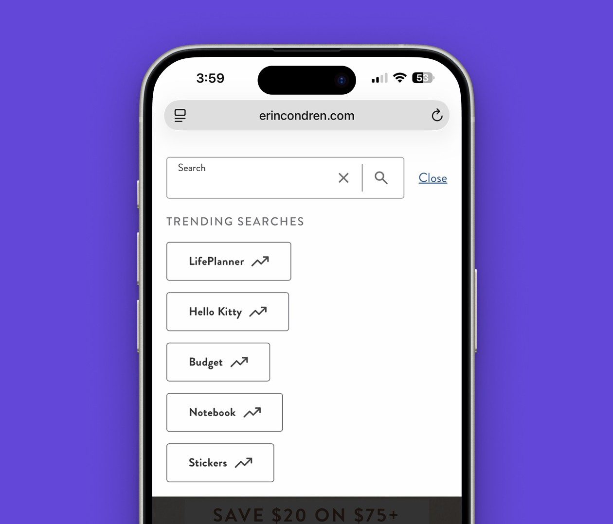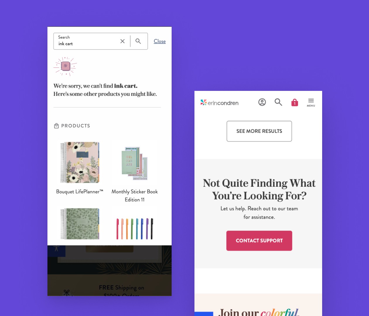 Most of Erin Condren's customers were shopping on mobile, but the search experience was built for desktop and hadn't been touched in years. It was utilitarian, hard to use on a small screen, and missing features that drive discovery and conversion in modern e-commerce. I led the end-to-end redesign from research through launch.