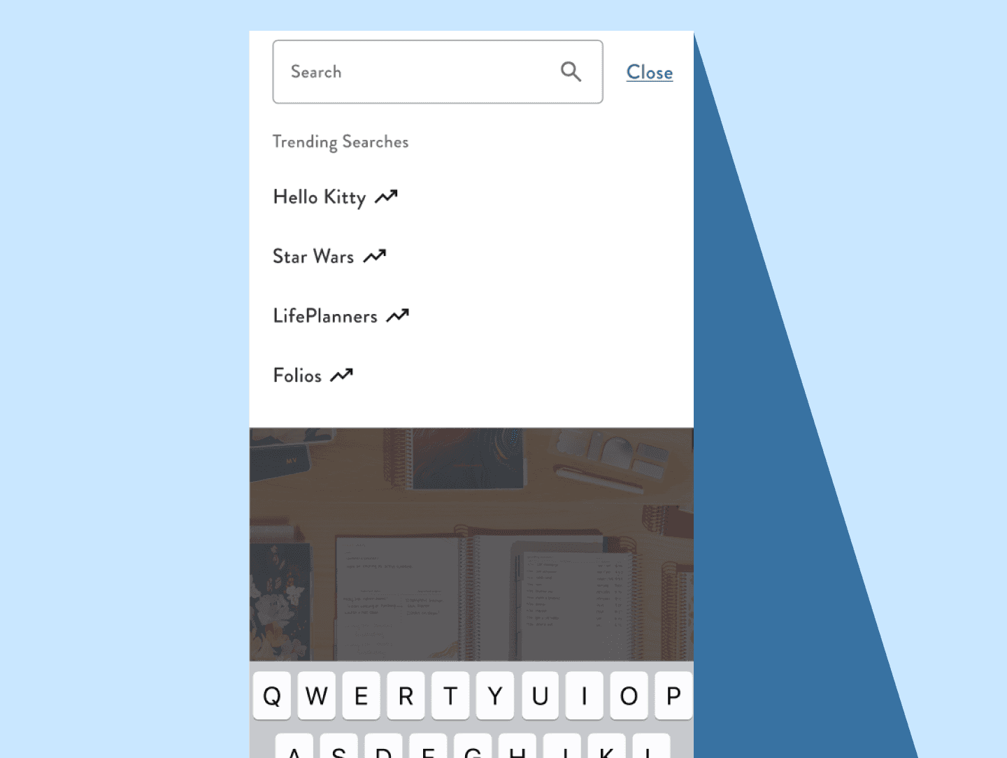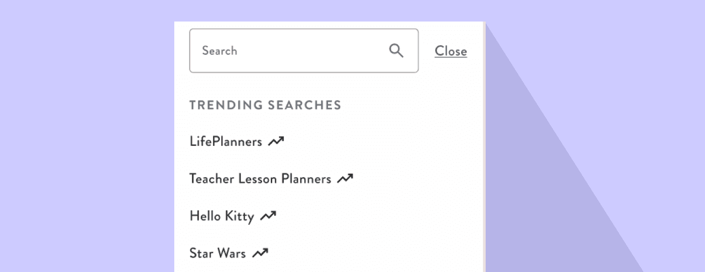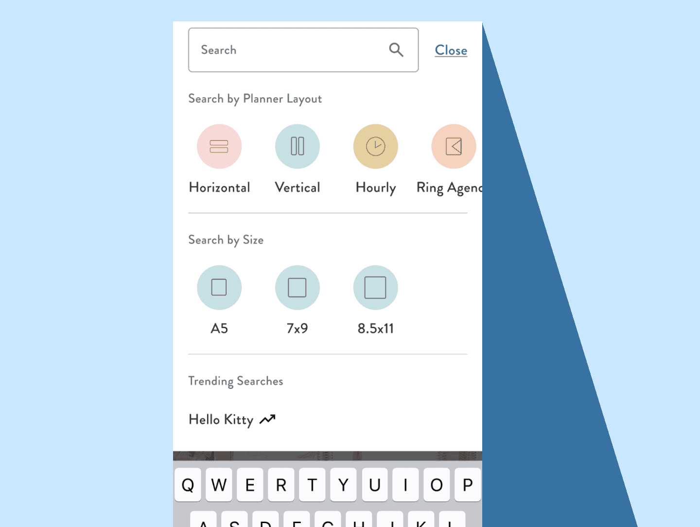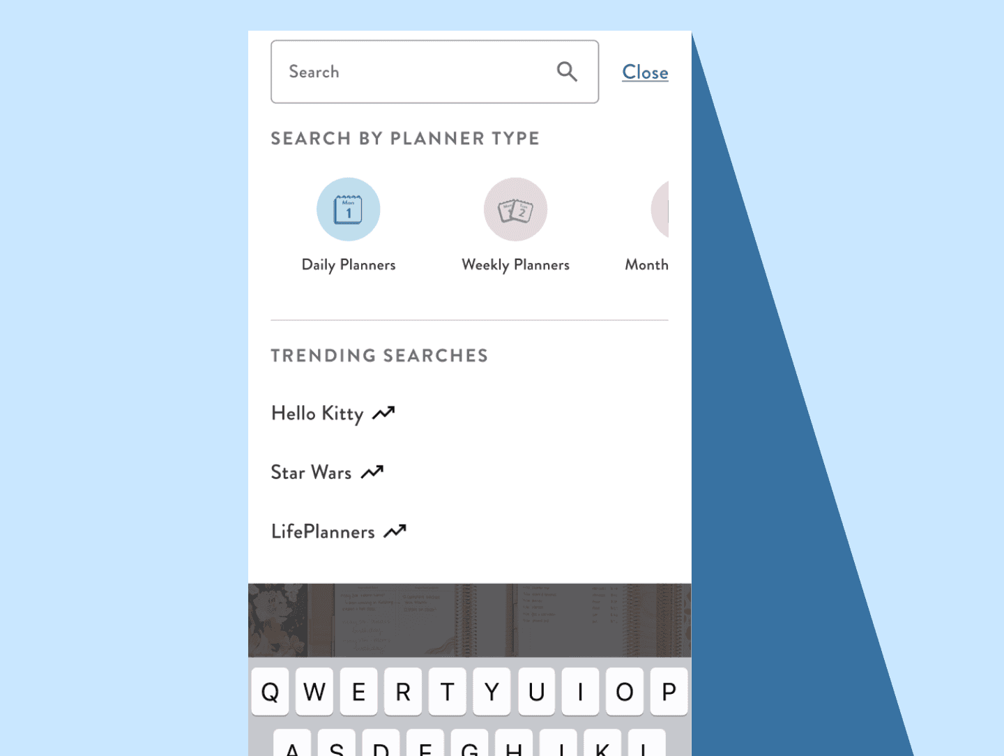 Version one included an initial search state that prioritized planner type, followed by trending searches.
