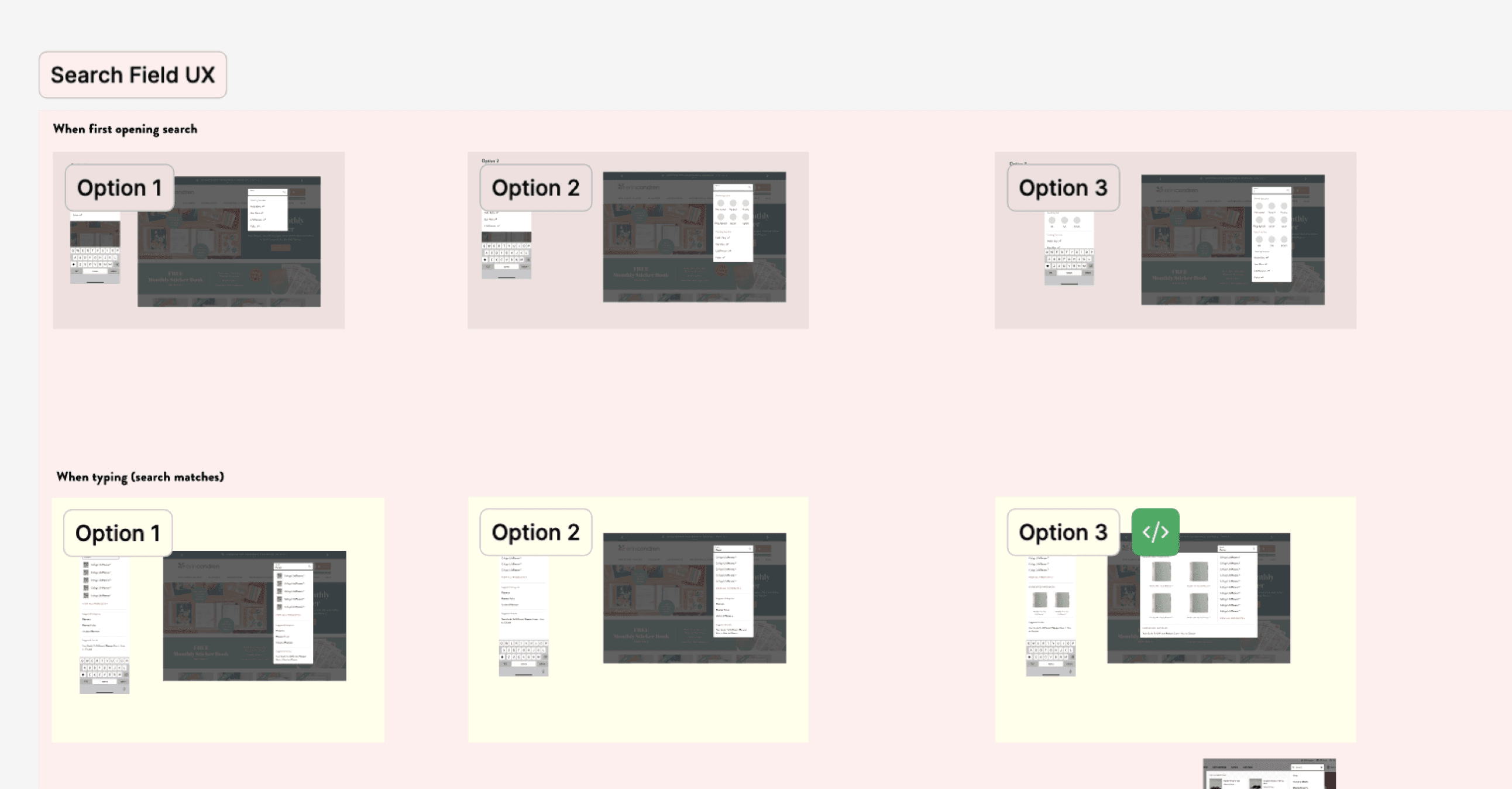 I conducted a remote usability test with Figma prototypes with two target customers. Each participant tested 3 versions of the initial search open experience, followed by the same search results design.