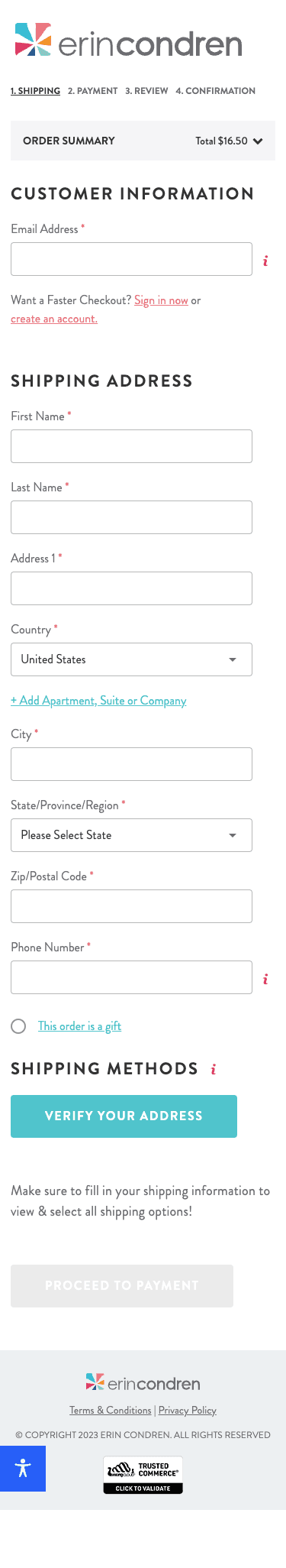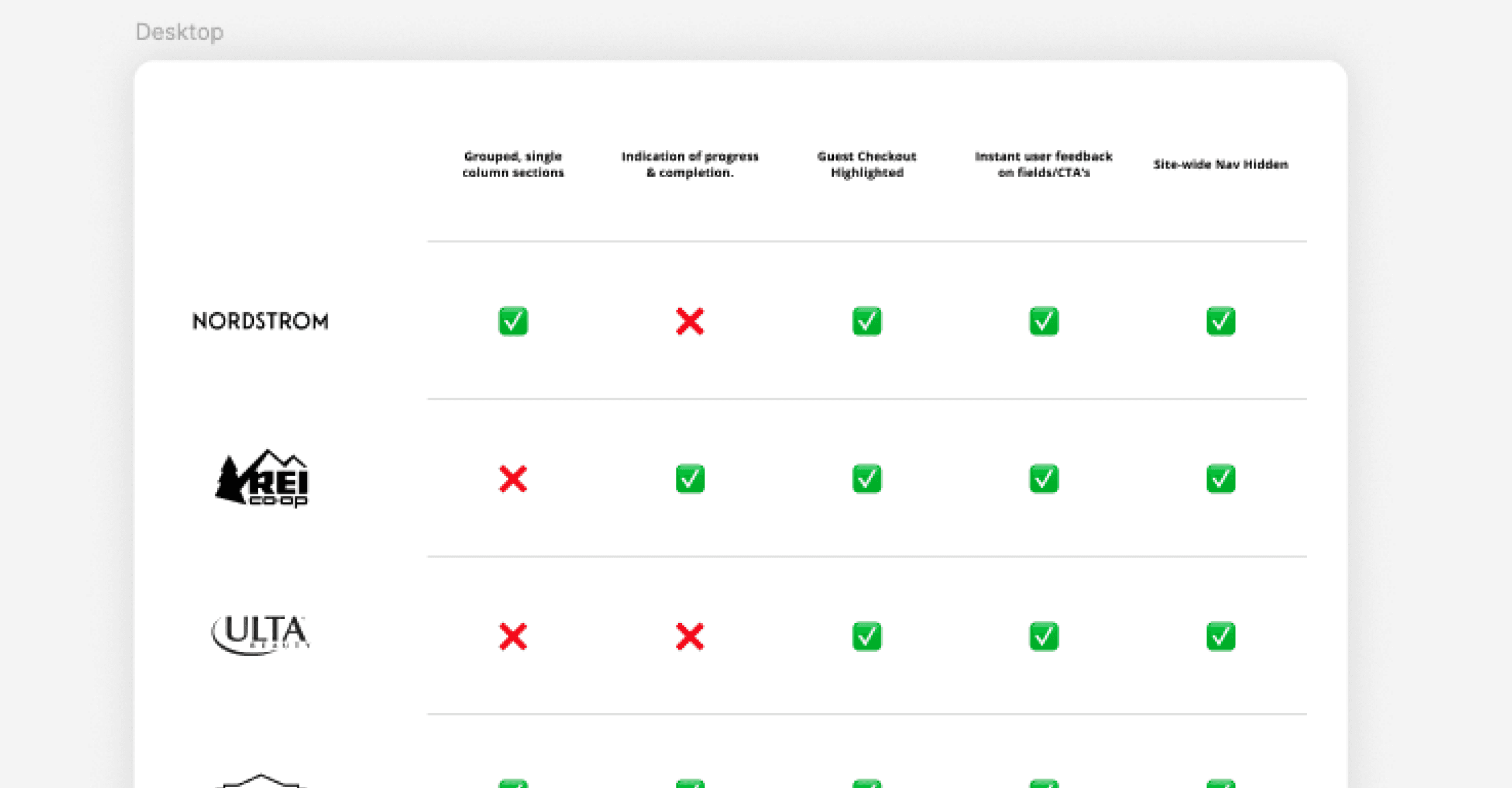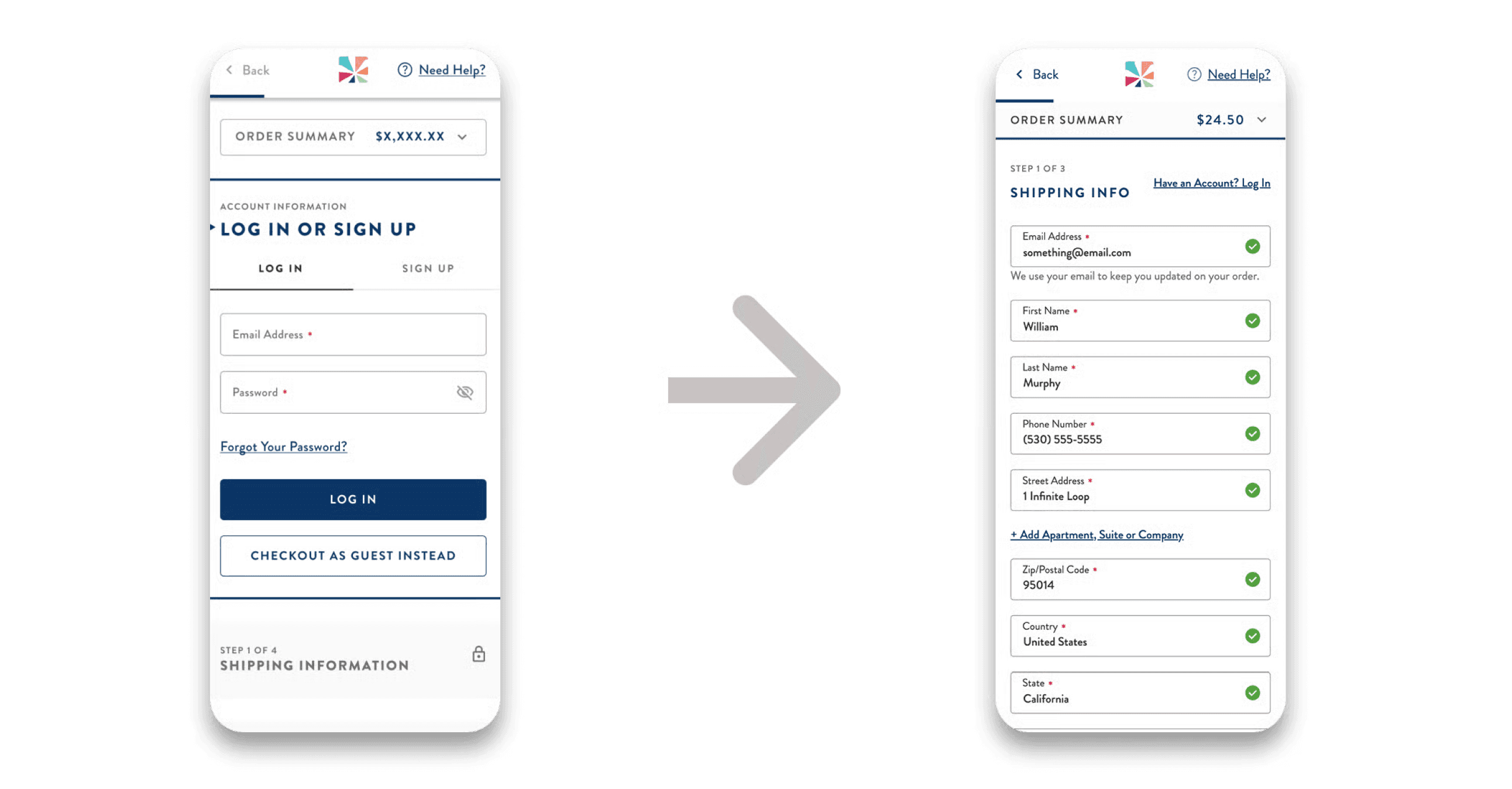 I combined the Contact and Shipping Information steps to reduce user effort. I deprioritized the Sign In/Checkout as a Guest option to a “Have an Account? Log In” link, believing it created unnecessary bottlenecks.
