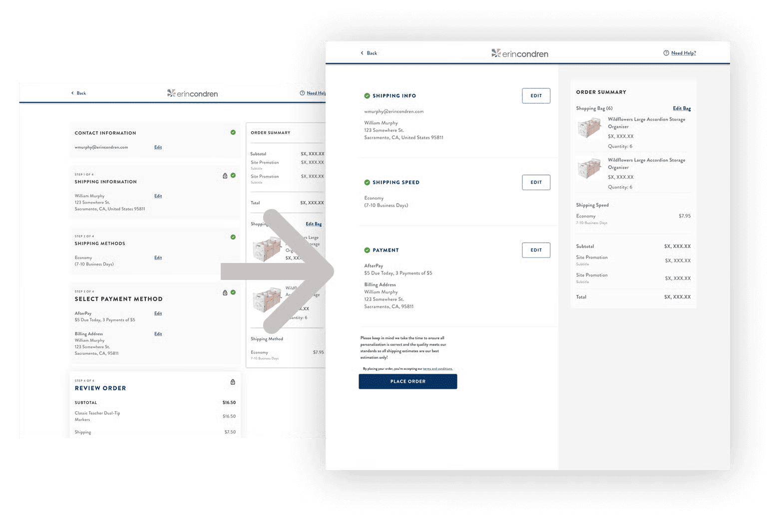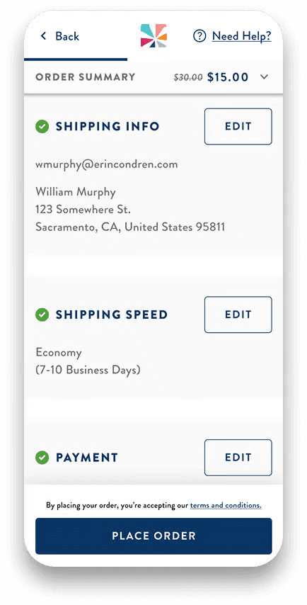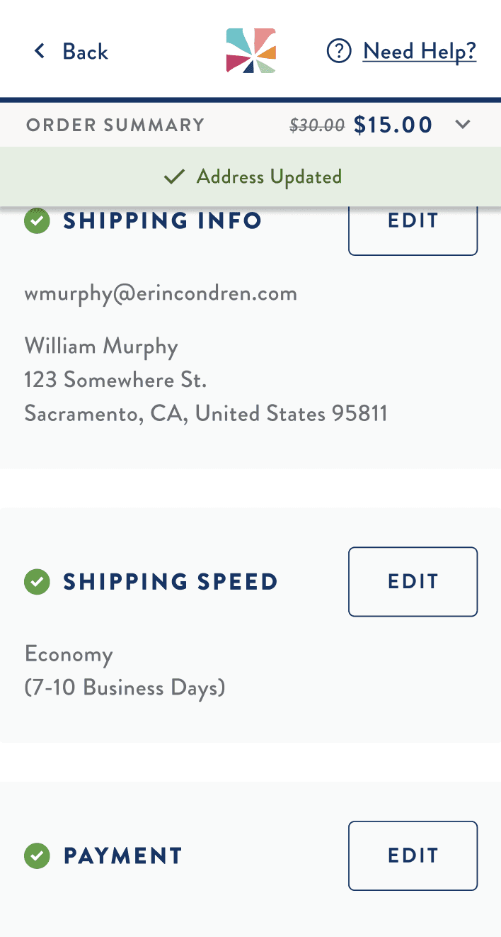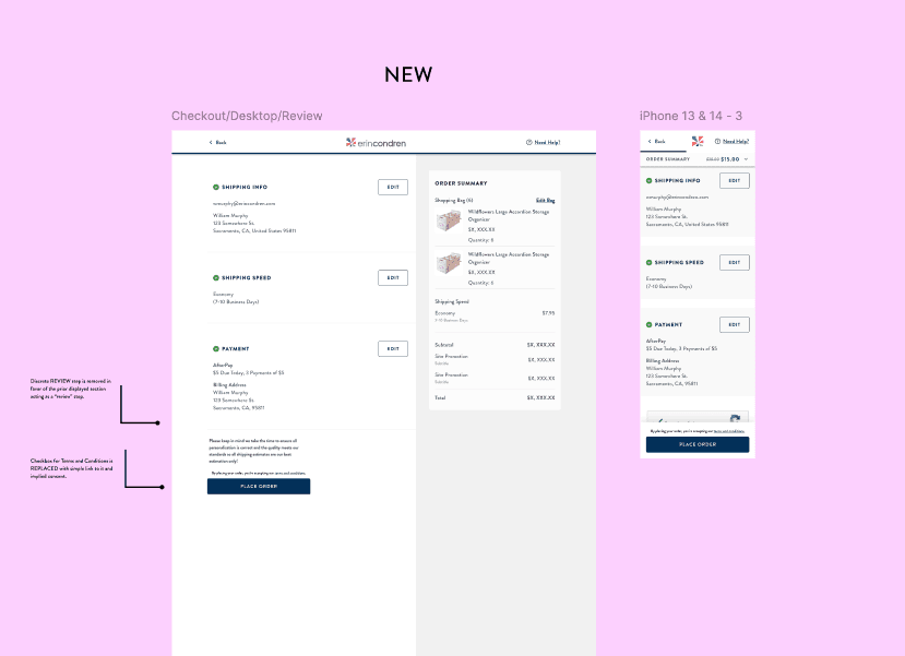 To further optimize for conversion, I removed the discrete Review step of the checkout flow, instead leaning on the completed states of each prior step to operate as a review.