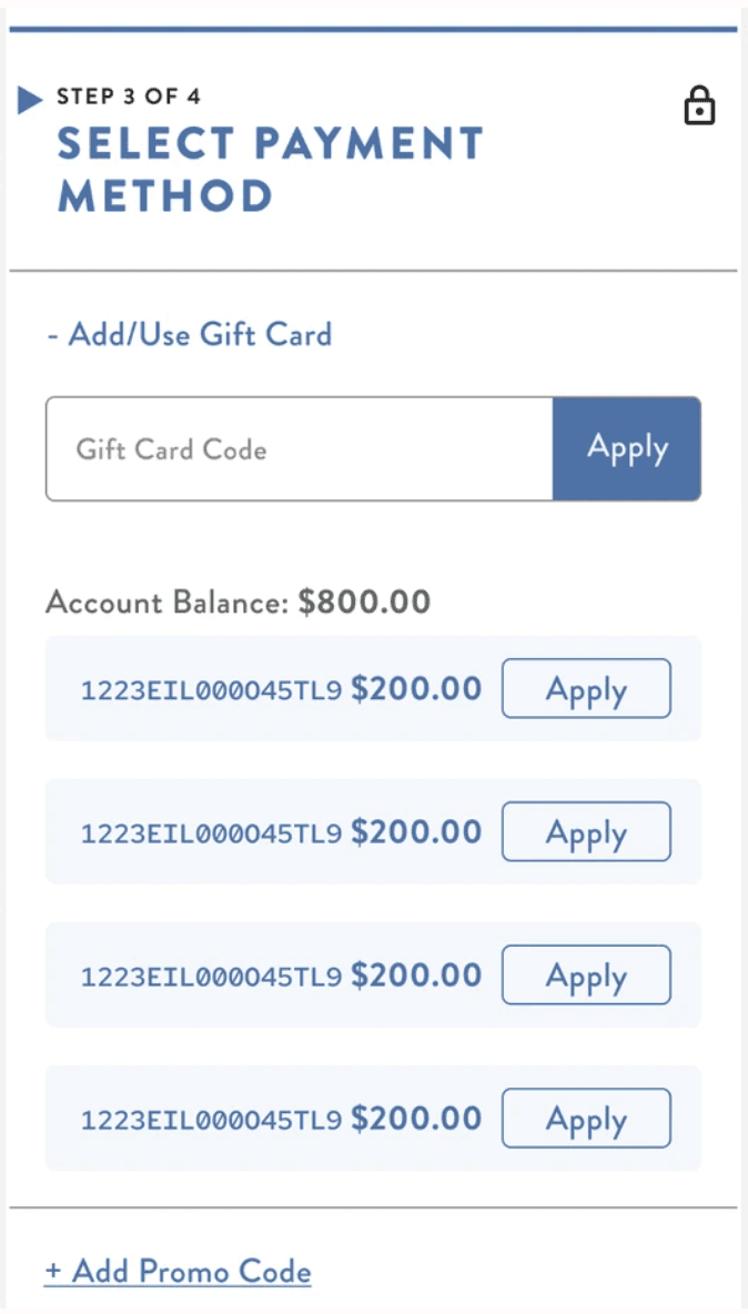 With stakeholders, I highlighted the cumbersome gift card experience participants noted during testing. I proposed simplifying it to allow users to use available credit easily. Backend limitations forced us to put on the back burner until post launch. We agreed, pending successful launch of new checkout, that we would revisit next year.